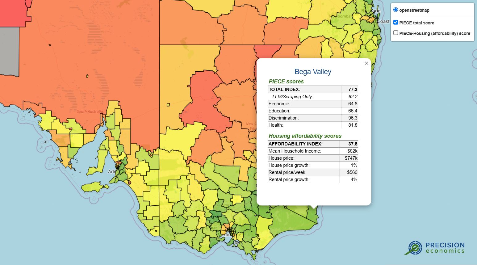 PIECE provides an up-to-date estimate (measured as a relative index, constructed using nested principal components analysis, PCA) of aggregate opportunities and disadvantages faced by people living throughout Australia (in all Local Government Areas, LGAs). Our Broadly, it focusses on economic capability, education levels, sources of discrimination, and health.
